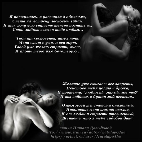 Количество просмотров пользователями: 10 Общее количество просмотров: 4394 Другие стихи автора: Легким поцелуем ты меня коснешься Легким поцелуем ты меня коснешься Поцелуем страстным завлеку я в сети О дивный сон, скорее явью стань! Я ТВОЯ | |||||||||||||||||||||||||||||||||